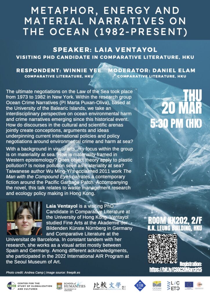 En marzo, Laia Ventayol impartió un seminario sobre materialidad en el mar en el Departamento de Literatura Comparada de la Universidad de Hong Kong, en el Centro para el Estudio de la Globalización y de las Culturas. Moderan la Prof. Winnie Yee y el Prof. Daniel Elam.